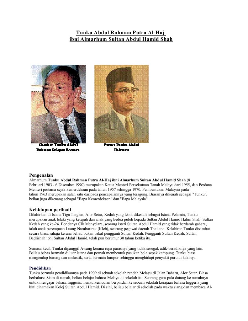 Pembentukan malaysia pada tahun 1963 merupakan salah satu daripada pencapaiannya yang teragung. Tunku abdul rahman putra al haj a prince beloved by all. 08 februari 1903, di istana tiga tingkat, alor setar (istana pagoda). Ds597.2 idr m 320.09595 idr jawatankuasa memorial kebangsaan memorial tunku abdul rahman putra.kuala lumpur: Anak melayu pertamalulusuniversiti di england beliaumeneruskanpengajiandalambidang perundangandi innertample,england;1949.