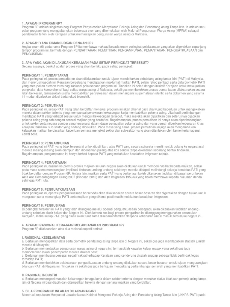 Program 6p adalah singkatan bagi program penyelesaian menyeluruh pekerja asing dan pendatang asing tanpa izin. Apakah yang dimaksudkan dengan 6p? Menyediakan perkhidmatan berkaitan pekerja asing seperti penyambungan permit plks tahun 11. Program 6p senarai semak pertukaran majikan; Angka enam (6) pada nama program 6p itu membawa maksud.